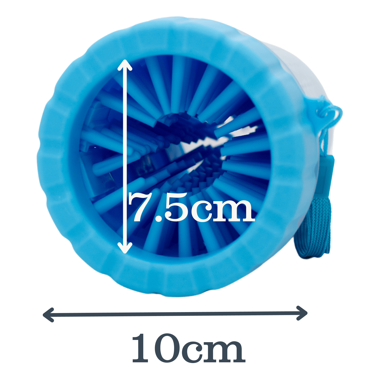 Simply fill the container with water, insert your dog's paw, and twist gently. The soft silicone bristles inside scrub away mud, dirt, and debris without irritating your dog’s skin.